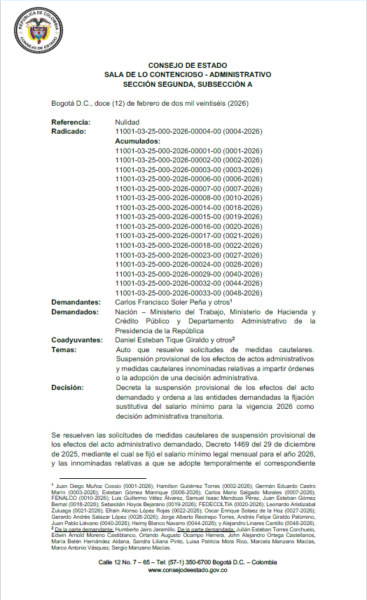 Suspensión del Salario Mínimo – CE, Auto del 12 de febrero de 2026 La Consejo de Estado, Sección Segunda, Subsección A, suspendió provisionalmente