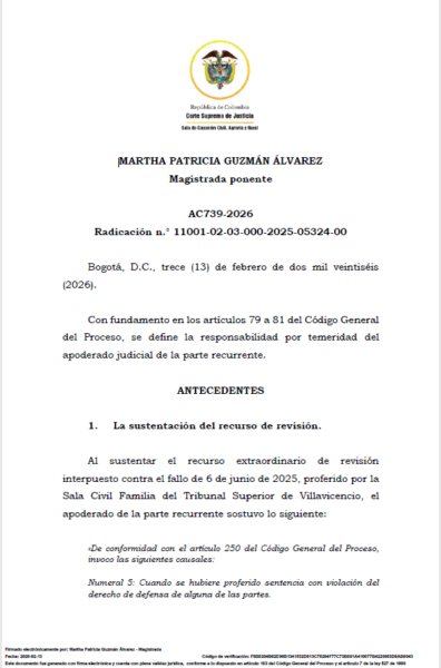 Uso de la inteligencia artificial en la elaboración de escritos procesales Mediante auto AC739-2026 (Rad. 11001-02-03-000-2025-05324-00), de 13 de febrero de